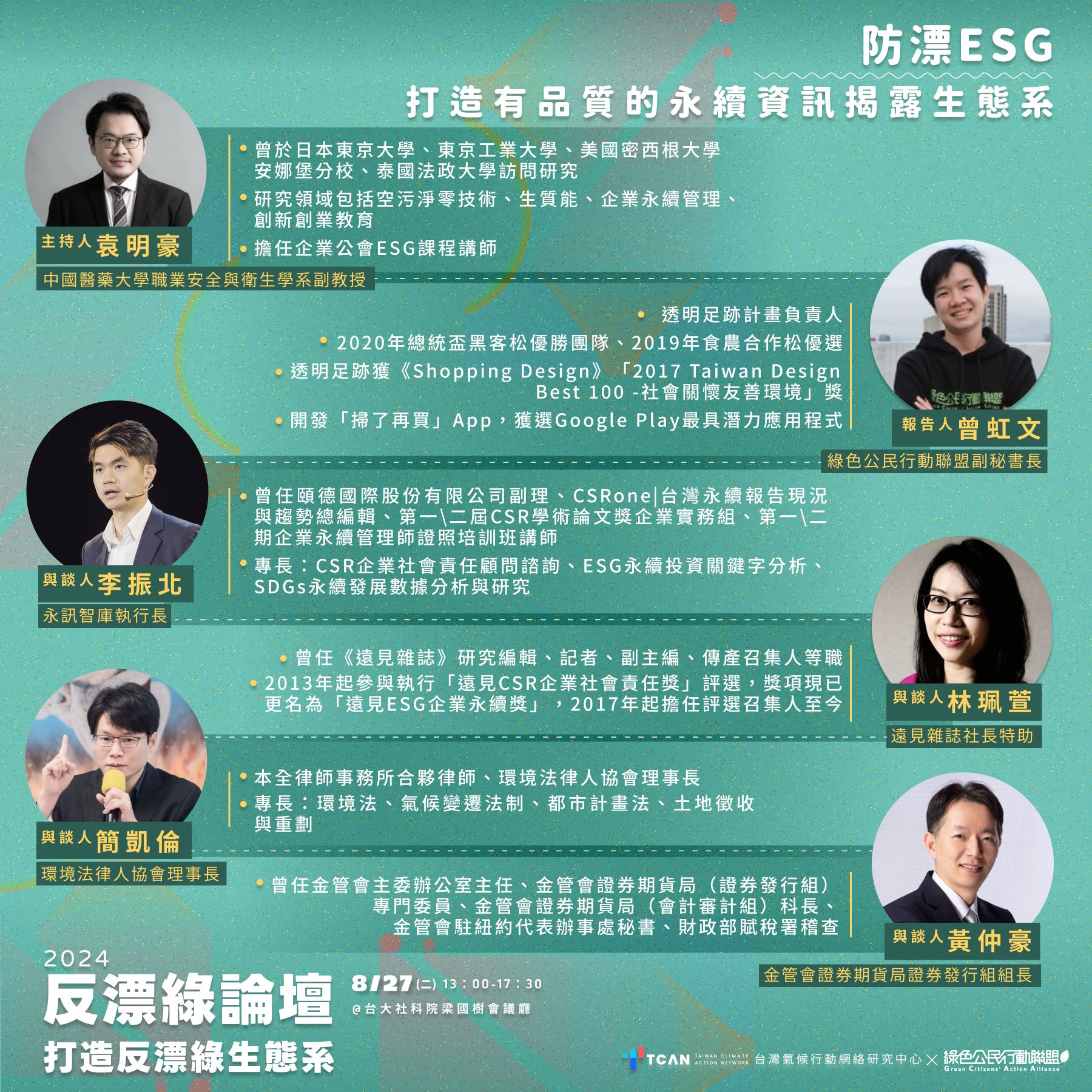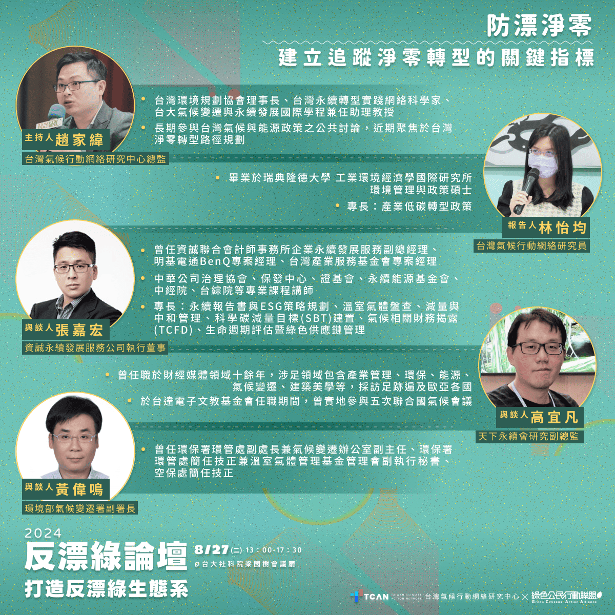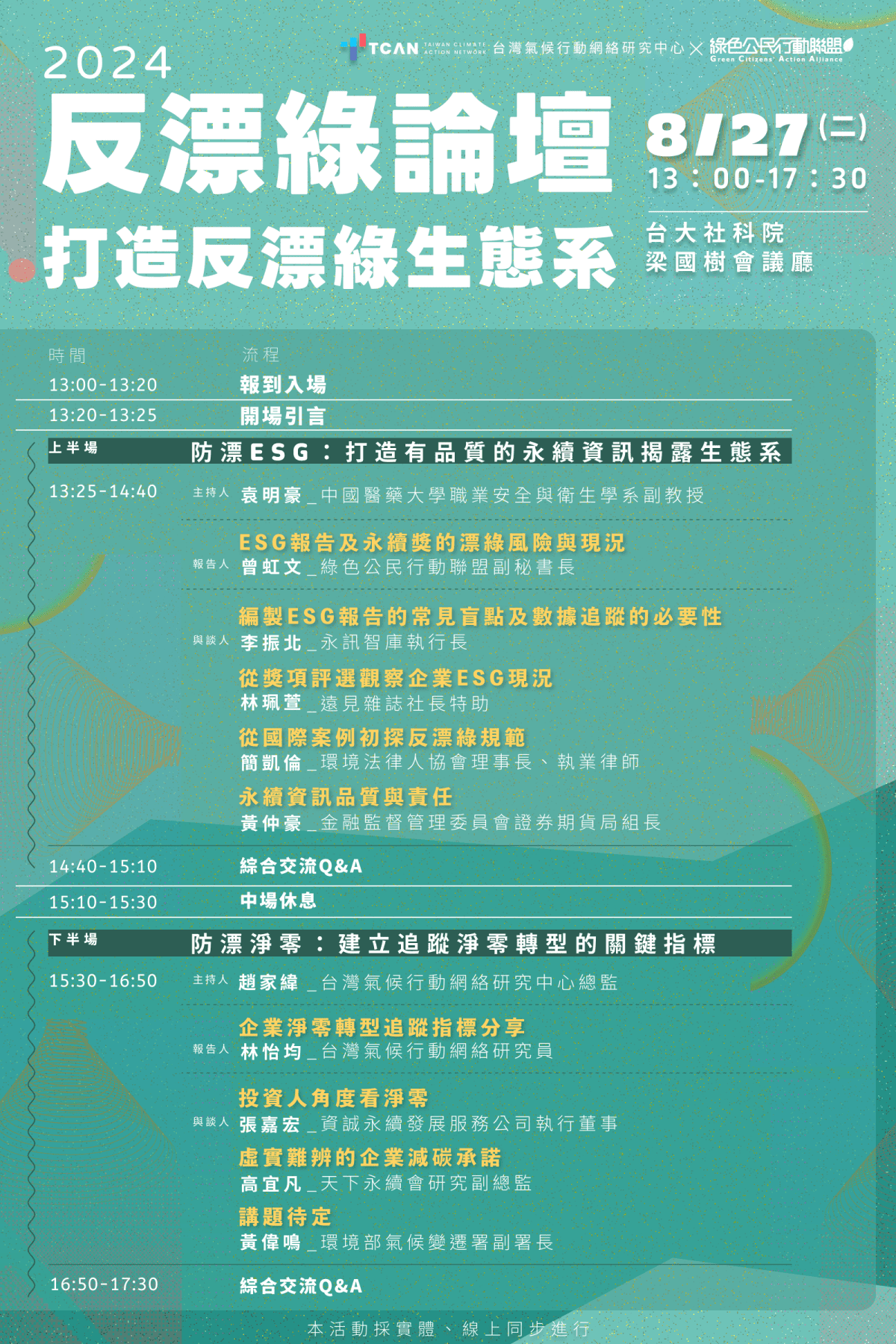 台灣綠色公民行動聯盟協會與台灣氣候行動網絡 - 2024年8月27日(二) 舉辦「2024反漂綠論壇—打造反漂綠生態系」,歡迎業界先進報名參加~